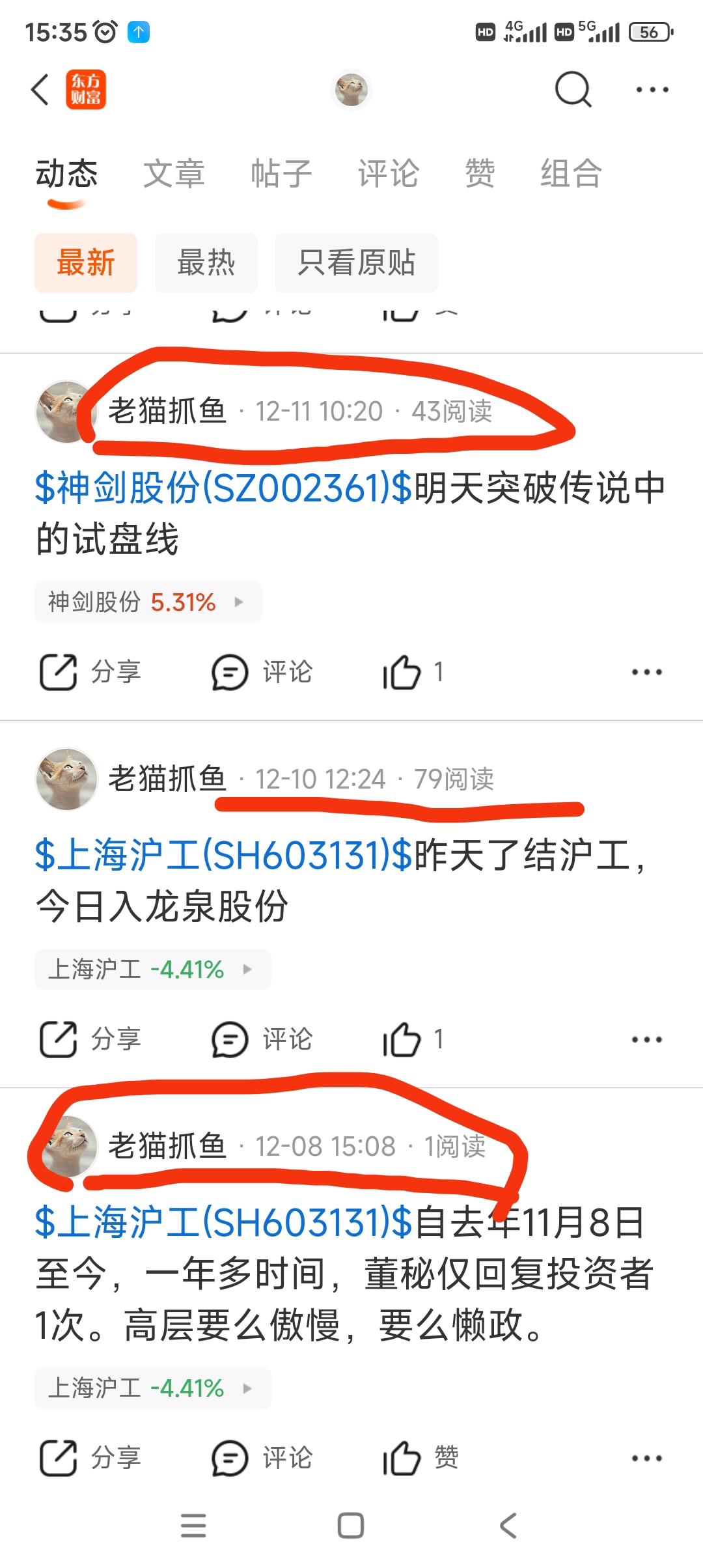 $上海沪工(SH603131)$ 12月8号收盘后示警泸工,9号哥跑了,10号入龙泉,11号认栽亏2个点割肉,转入神剑。哥习惯中线波段,但若认为不妙,也果断割肉,不抱幻想死守。