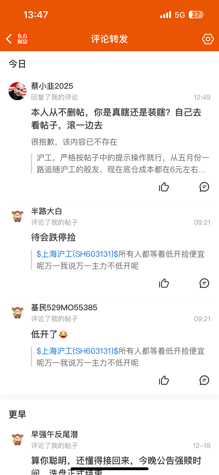 $上海沪工(SH603131)$ 一天天到晚装,昨天卖飞了,然后今天说是昨天涨停卖了今天又买回来了真恶心