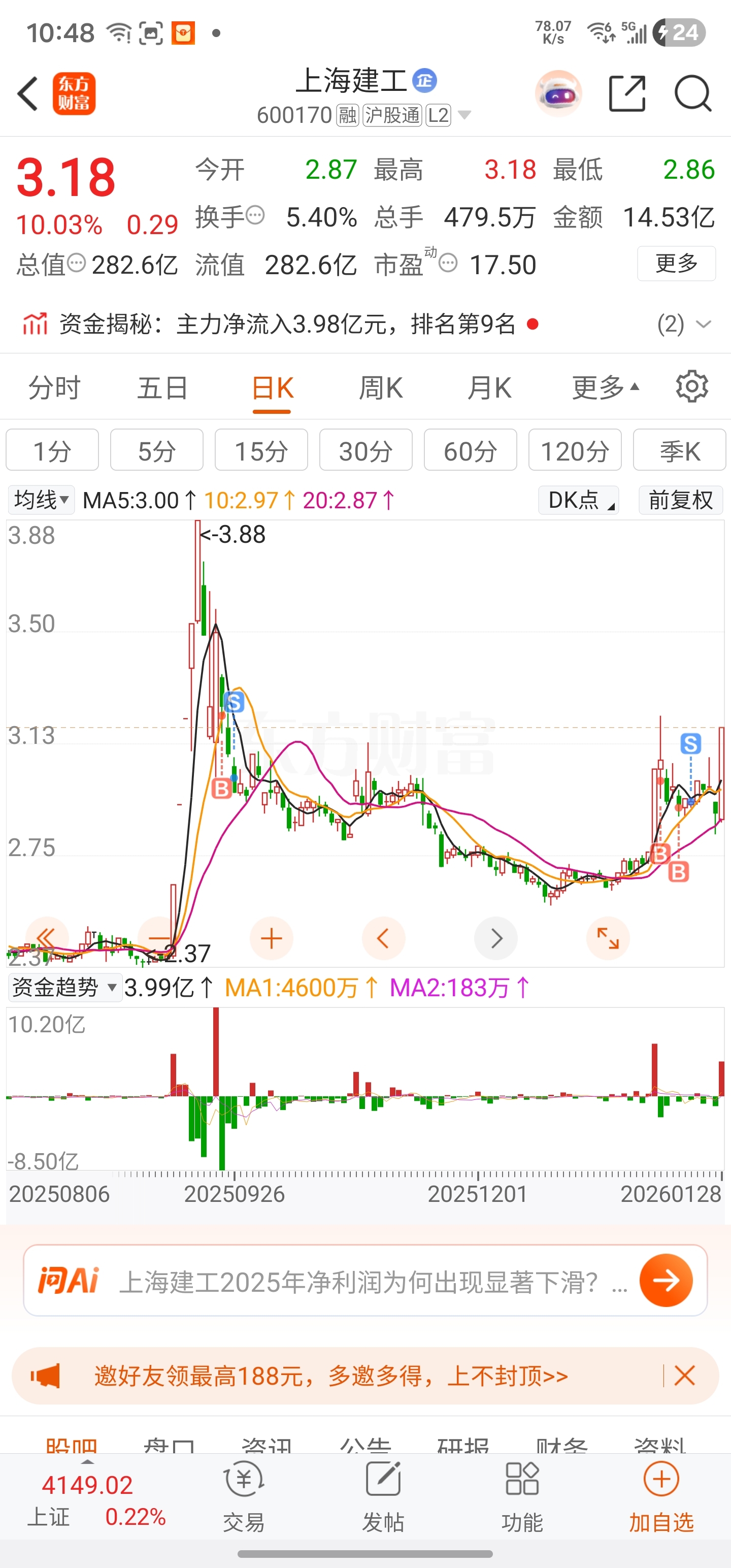 $上海沪工(SH603131)$ 前几天把建工卖了,买得沪工,好吧,那边涨停,这边套我13个点
