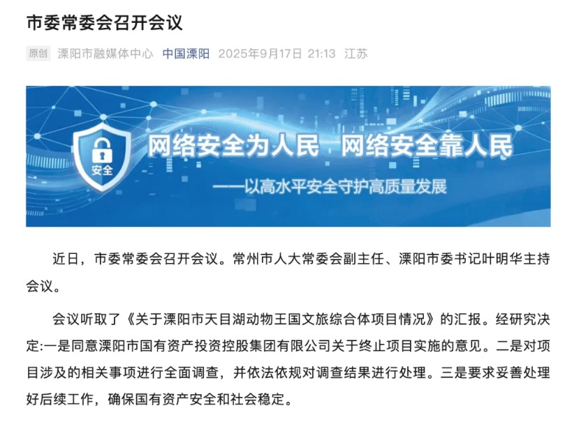 同日晚间,溧阳市融媒体中心官方公众号“中国溧阳”发布的消息显示:“近日,市委常委会召开会议。常州市人大常委会副主任、溧阳市委书记叶明华主持会议。会议听取了《关于溧阳市天目湖动物王国文旅综合体项目情况》的汇报。经研究决定:一是同意溧阳市国有资产投资控股集团有限公司关于终止项目实施的意见。二是对项目涉及的相关事项进行全面调查,并依法依规对调查结果进行处理。三是要求妥善处理好后续工作,确保国有资产安全和社会稳定。”