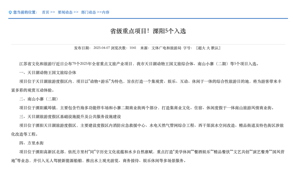 今年4月7日,溧阳市人民政府官网消息显示:“江苏省文化和旅游厅近日公布79个2025年全省重点文旅产业项目,我市天目湖动物王国文旅综合体、南山小寨(二期)等5个项目入选。”