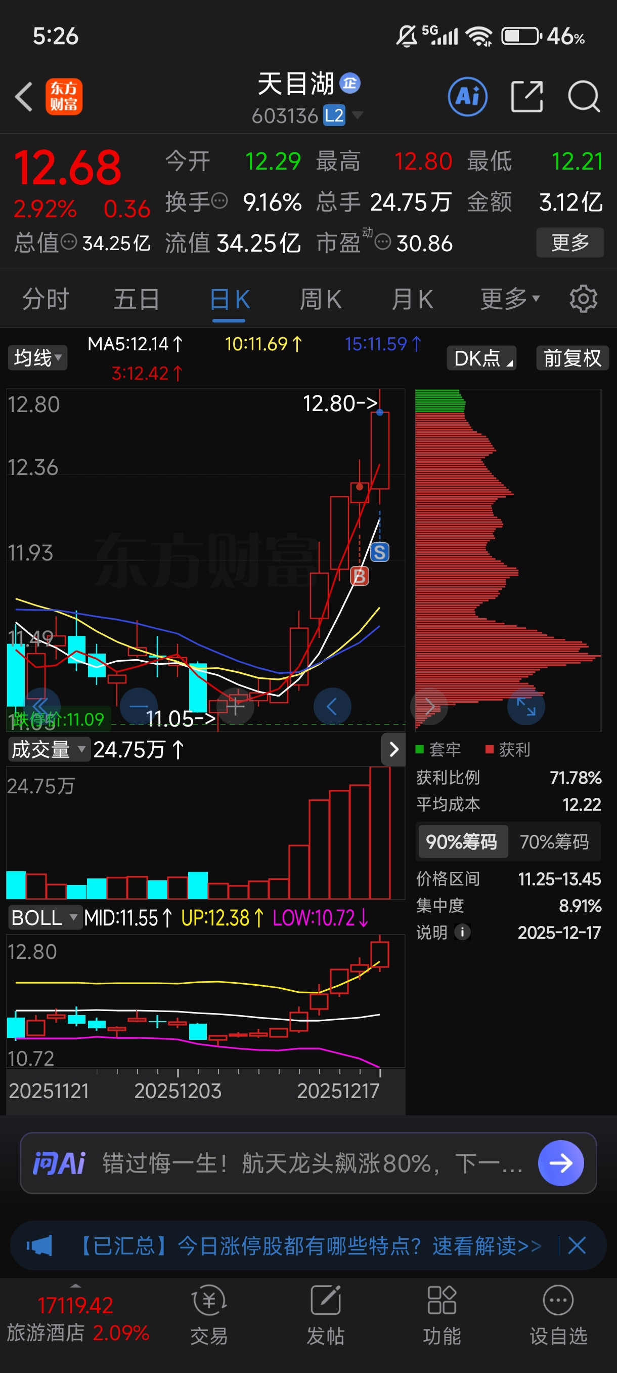 $天目湖(SH603136)$ 我是真的感觉今天卖飞了,我看好明天继续涨,但是又不敢继续拿着,很矛盾的一个心里状态