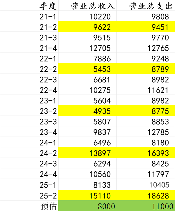 本来不想多嘴的,但是实在忍不住,根据历史数据测算,三季报出来利润应该是负8000万-负8500万之间,亏损扩大。预测三季度单季度营业收入8000万,成本1亿1