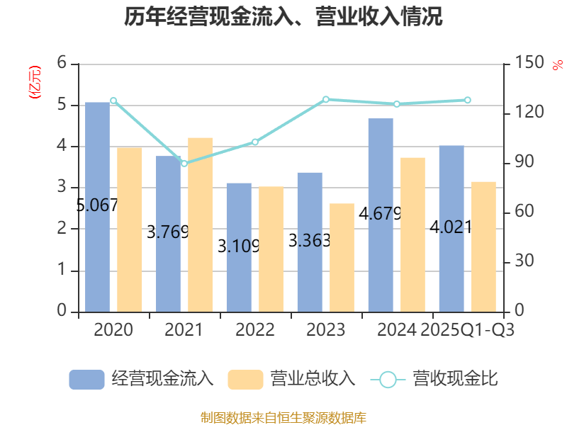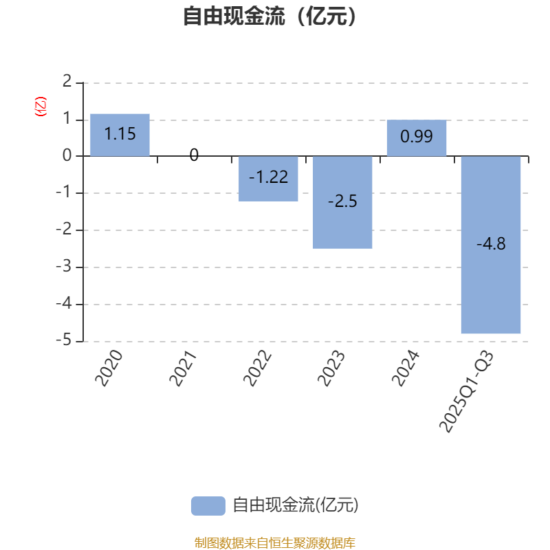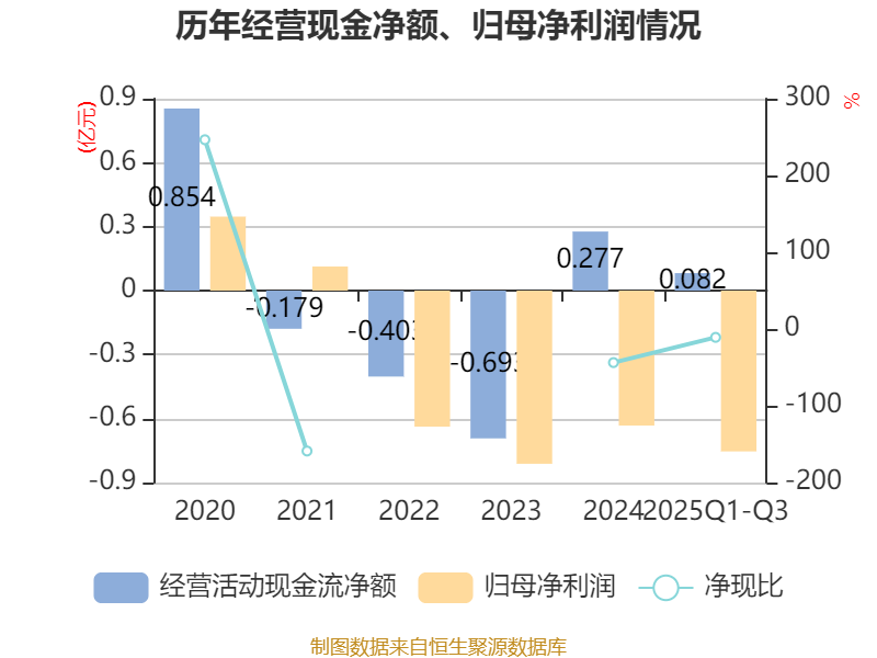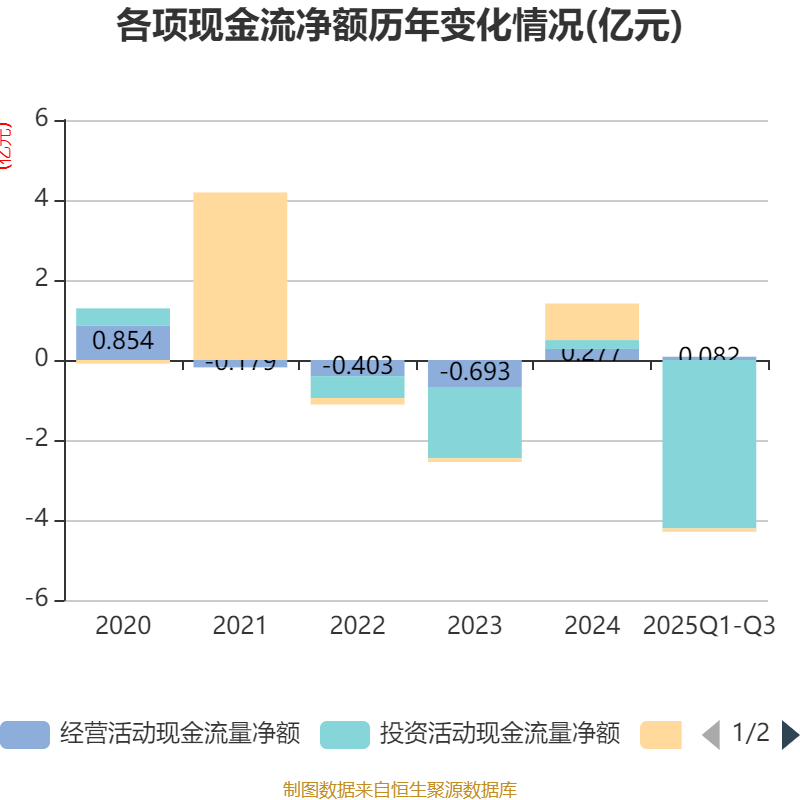 2025年前三季度,公司经营活动现金流净额为821.67万元,同比增加1988.57万元;筹资活动现金流净额-859.43万元,同比减少1.04亿元;投资活动现金流净额-4.21亿元,上年同期为-2.7亿元。