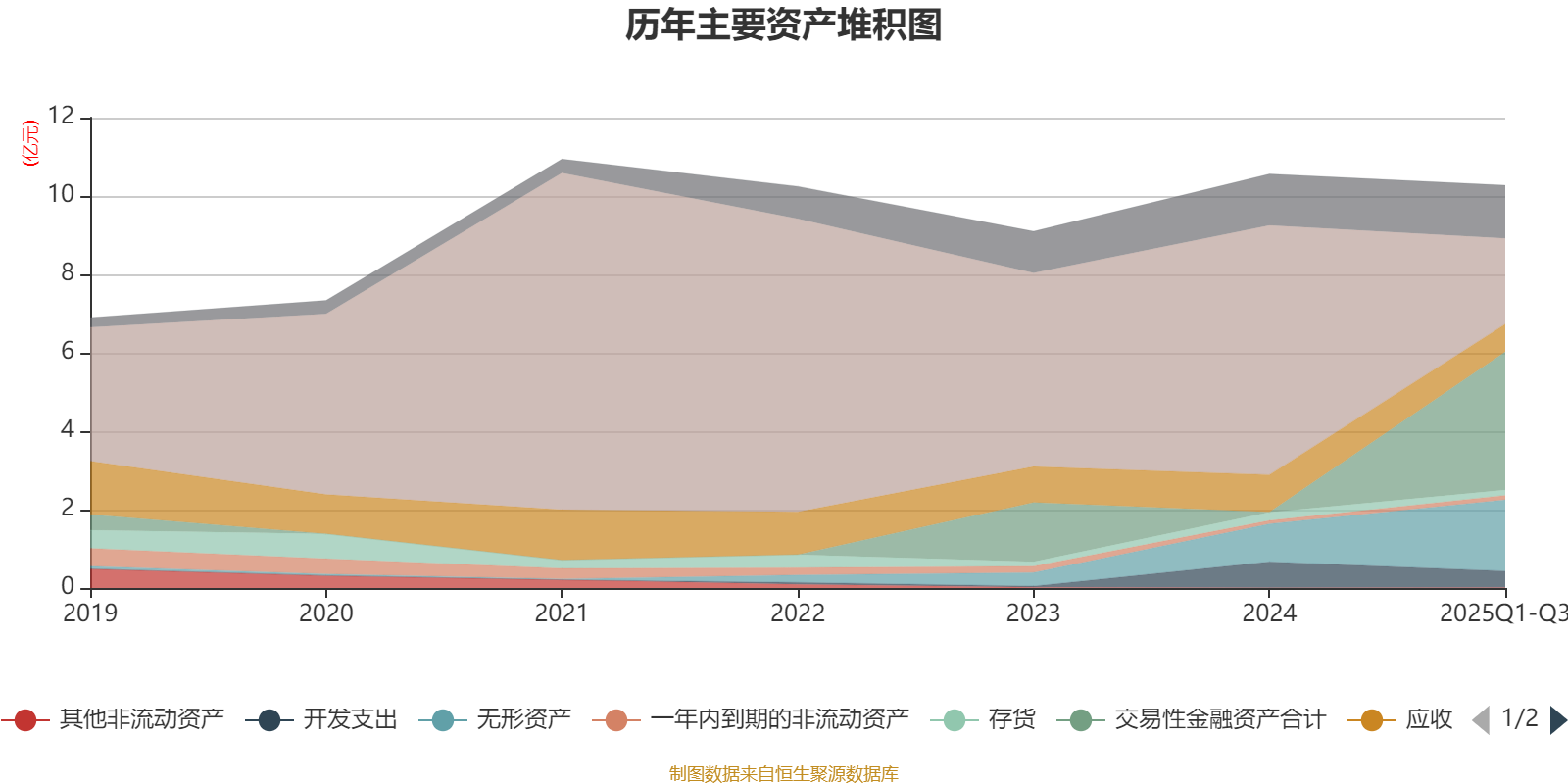 资产重大变化方面,截至2025年三季度末,公司货币资金较上年末减少65.61%,占公司总资产比重下降38.93个百分点;交易性金融资产合计较上年末增加200428.67%,占公司总资产比重上升34.27个百分点;无形资产较上年末增加87.52%,占公司总资产比重上升8.52个百分点;开发支出较上年末减少36.97%,占公司总资产比重下降2.21个百分点。