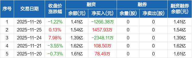 海量数据:融资净偿还1266.38万元,融资余额1.41亿元(11-26)