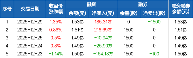 海量数据:融资净买入185.31万元,融资余额1.53亿元(12-29)