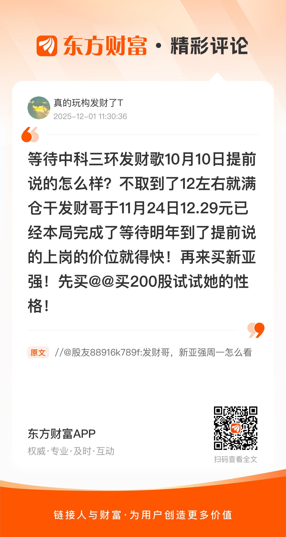 等待中科三环发财哥10月10日提前说的怎么样?布局到了12左右就满仓干发财哥于11月24日12.29元已经本局完成了等待明年到了提前说的上涨的价位就要溜得飞起!后再来买新亚强!先买200股试试她的性格!上周五买的!