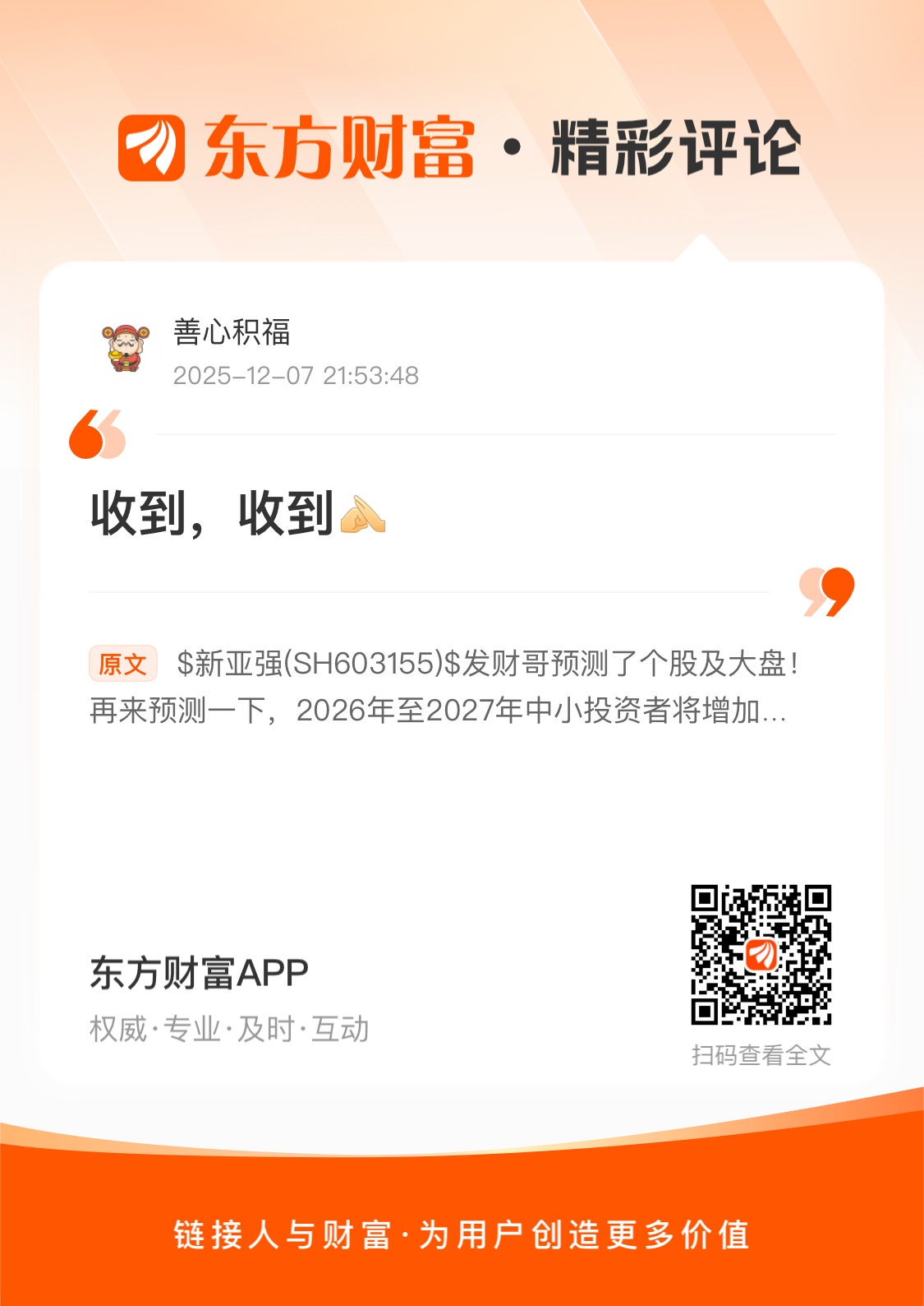 $新亚强(SH603155)$ 发财哥预测了个股及大盘!再来预测一下,2026年至2027年中小投资者将增加20,000,000左右!都是提前说的,看这次预测的准不准!
