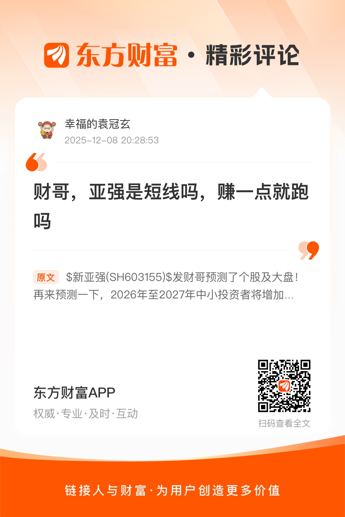 $新亚强(SH603155)$ 发财哥预测了个股及大盘!再来预测一下,2026年至2027年中小投资者将增加20,000,000左右!都是提前说的,看这次预测的准不准!