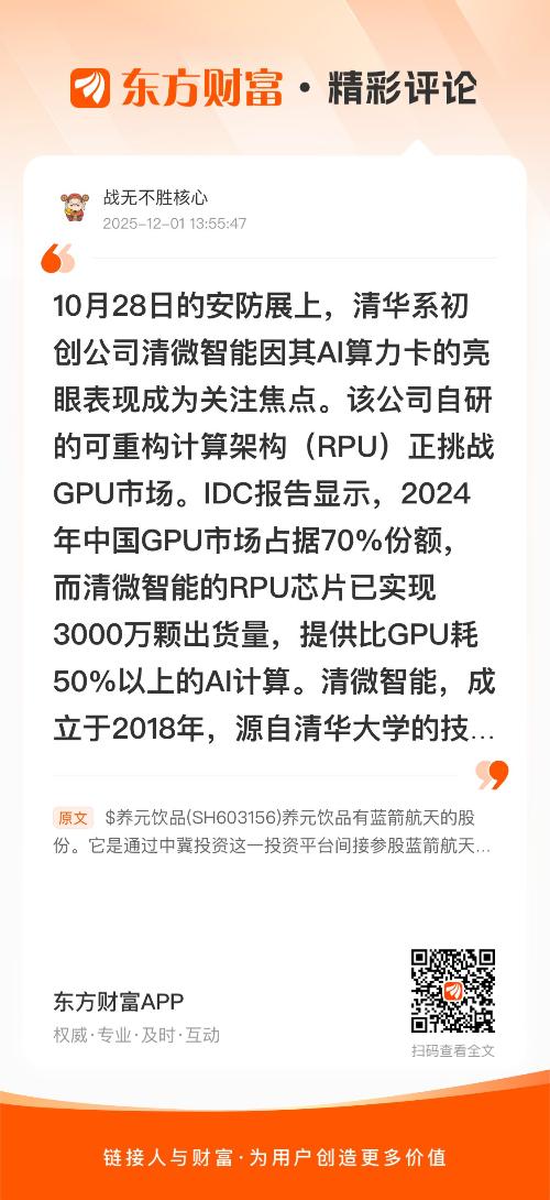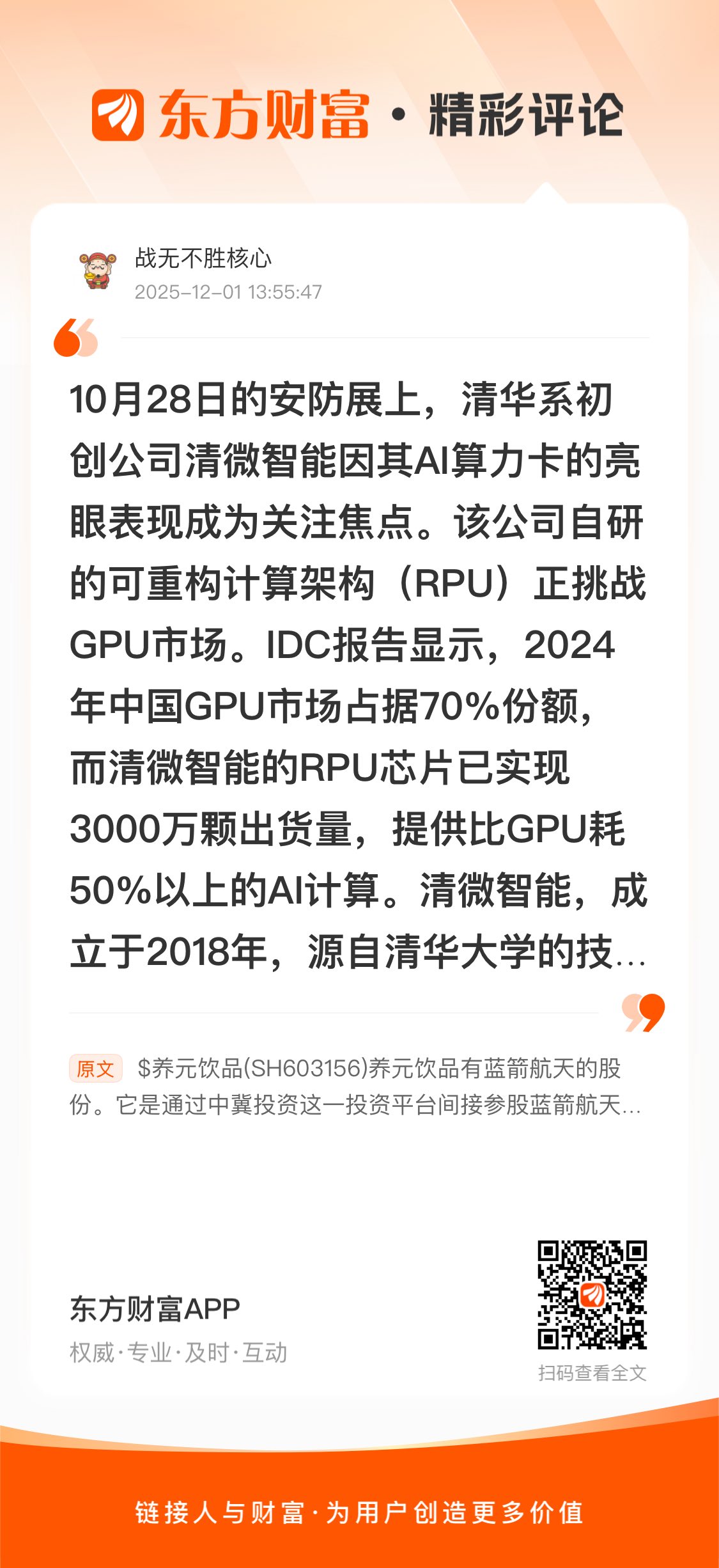 晚上等公告//@战无不胜核心 : 10月28日的安防展上,清华系初创公司清微智能因其AI算力卡的亮眼表现成为关注焦点。该公司自研的可重构计算架构(RPU)正挑战GPU市场。IDC报告显示,2024年中国GPU市场占据70%份额,而清微智能的RPU芯片已实现3000万颗出货量,提供比GPU耗50%以上的AI计算。清微智能,成立于2018年,源自清华大学的技术积累,其可重构芯片已应用于智能安防、工业、机器人等领域。公司计划开放端侧AI算法训练平台,提升开发效率。RPU芯片在能效、扩展性和灵活性上优于GPU,已在智算中心、金融、能源等行业找到应用。
