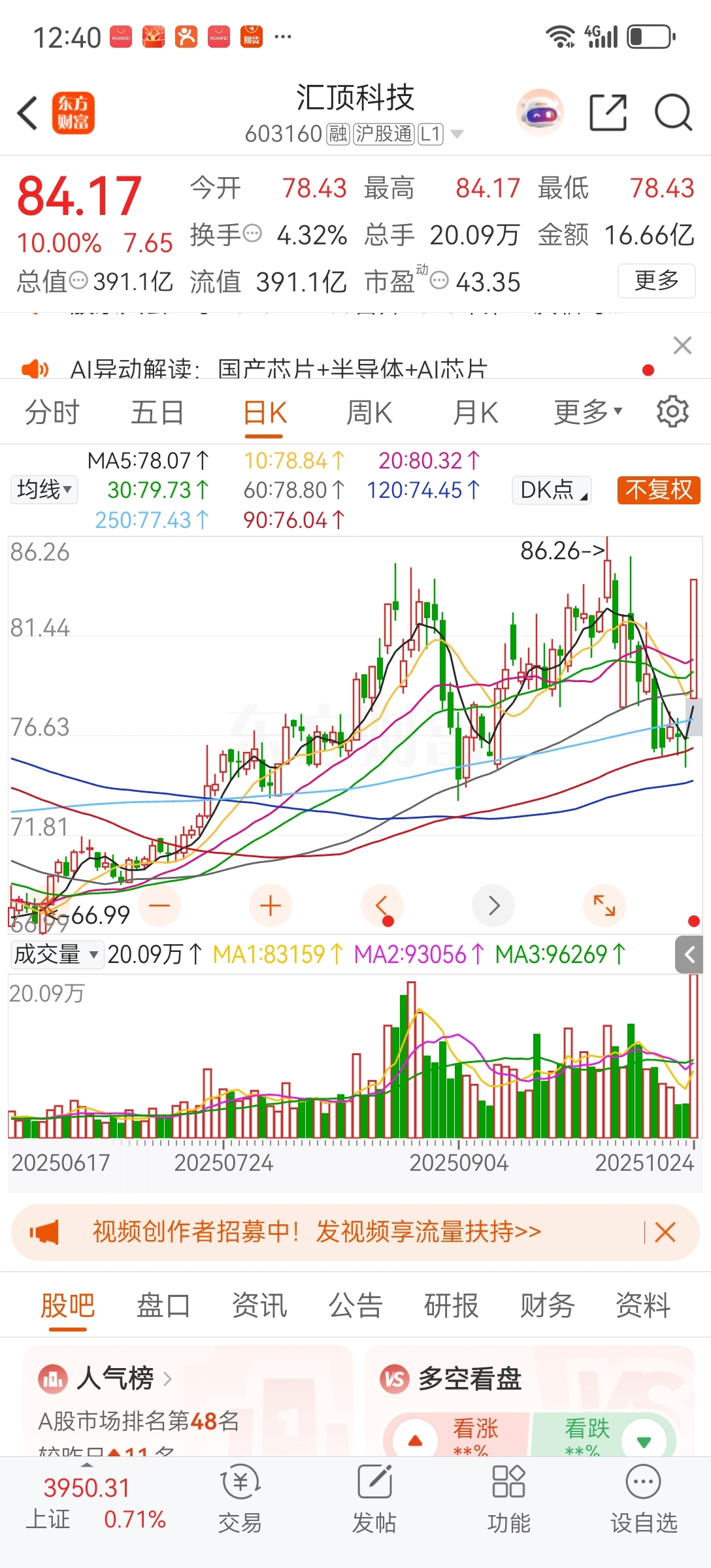 $汇顶科技(SH603160)$ 集合竞价疯狂砸盘,低开在10日线左右78附近开盘,血洗,出逃吧兄弟们