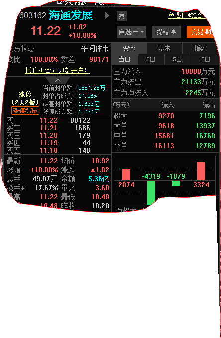 这个涨停板会炸板,聪明的可以在涨停板抛出,因为她虽然封板,主力资金净流出2384万,可能有些散户也要清仓抛出,因为封板在主力资金流出的情况下勉强封板,下一个开市可能是低开。我是在涨停板卖,2天2板,第二版很弱,不会有第3板,主力只留入2千万,从计算看,是散户资金拉的板,总之,今天在涨停板卖,是最高的收入,下午会抢着在涨停板卖出