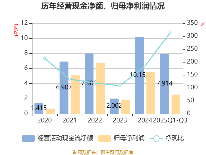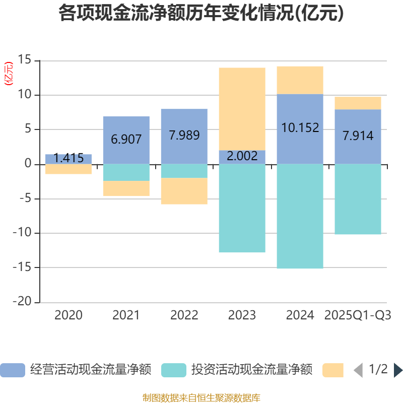 2025年前三季度,公司经营活动现金流净额为7.91亿元,同比增长2.84%;筹资活动现金流净额1.83亿元,同比减少1.89亿元;投资活动现金流净额-10.18亿元,上年同期为-11.56亿元。