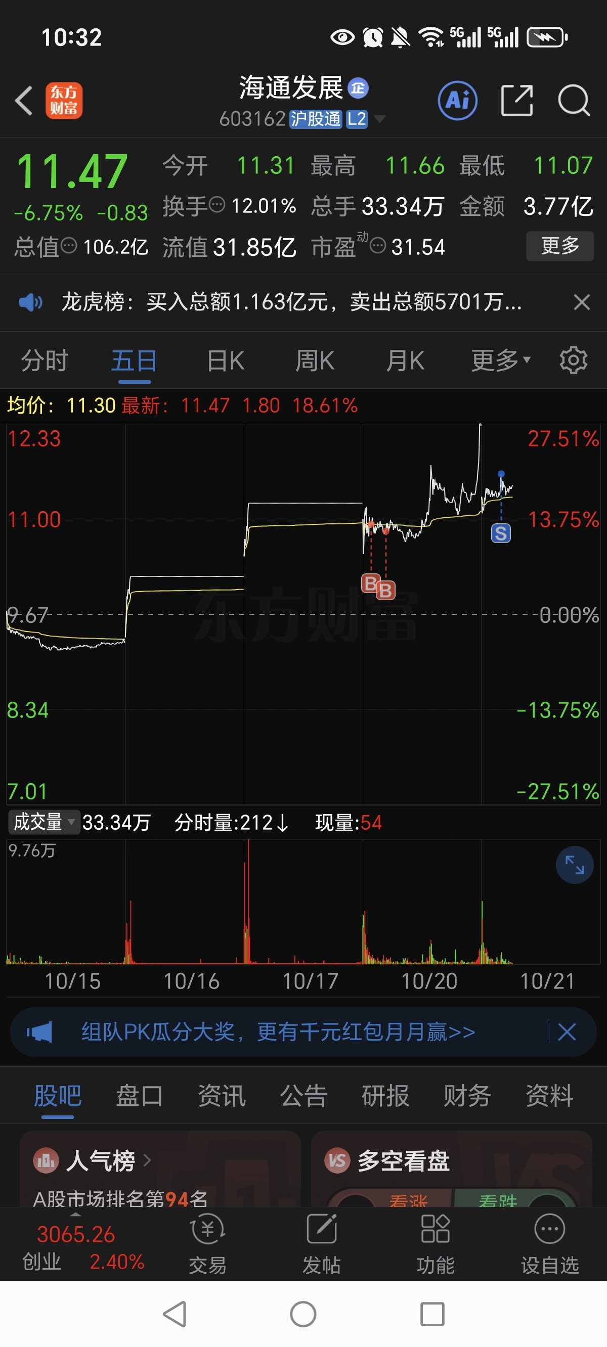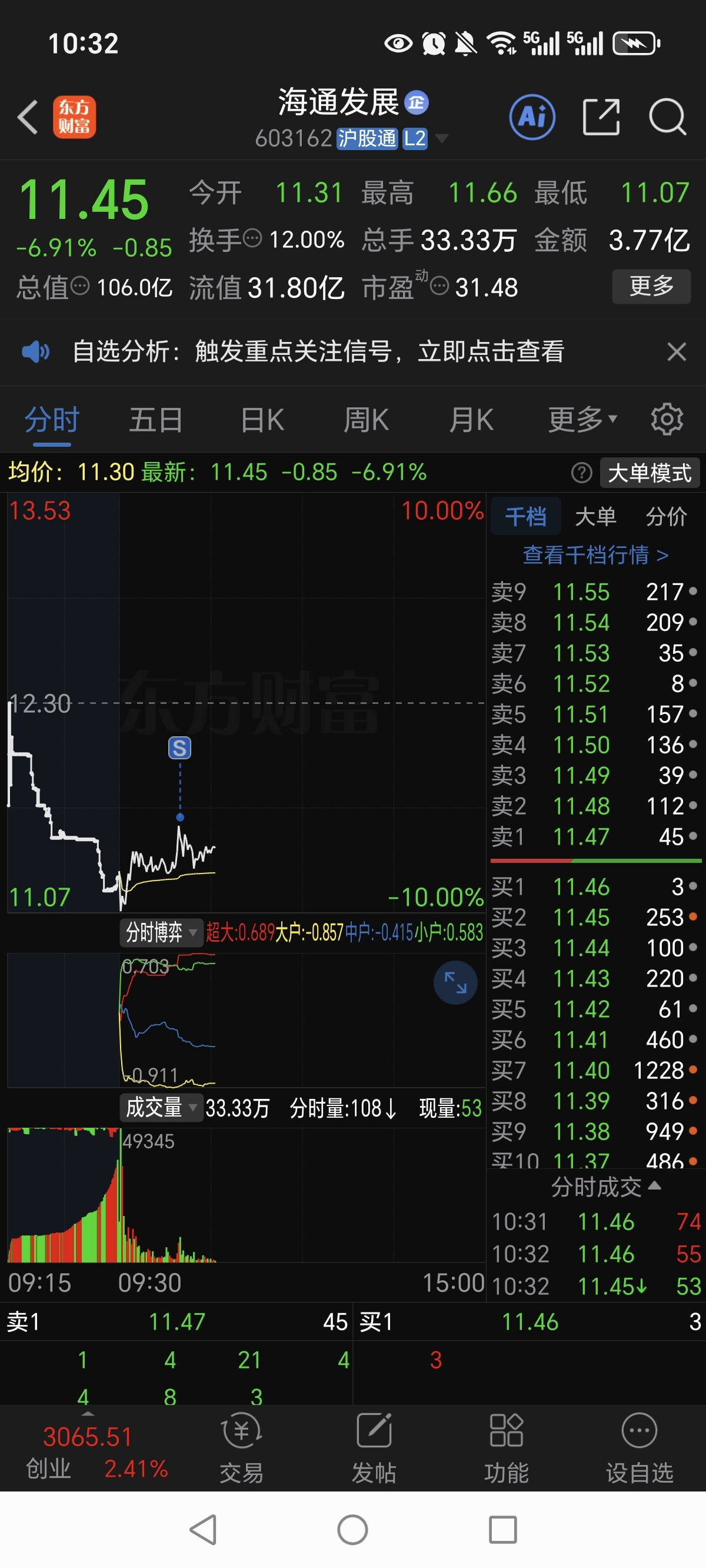 昨天10.86买的海通发展,今天11.65已卖,感觉卖飞,13个点利润缩水至7个