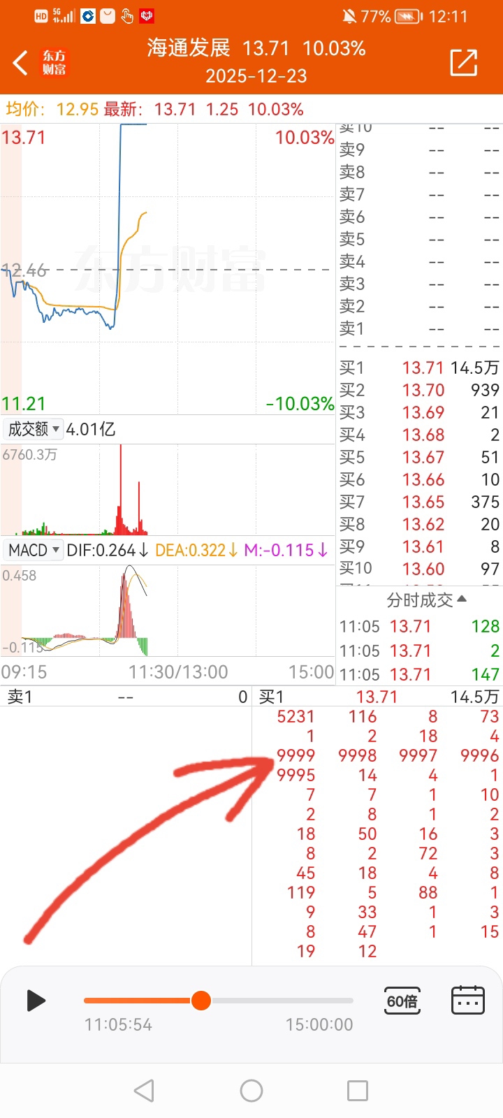 五个万手大单(9999,9998,9997,9996,9995手)打板买入并成交