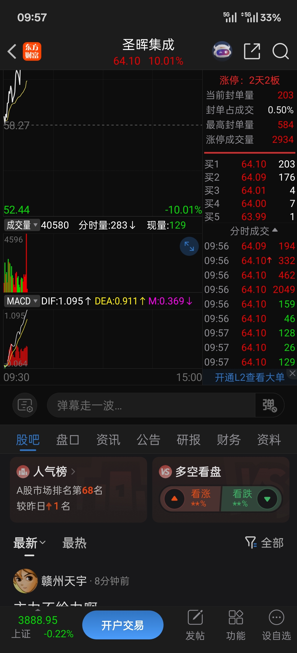 $圣晖集成(SH603163)$ 你是真牛皮,300手就封涨停?