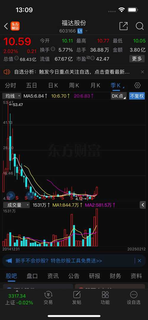 总股本规模:福达股份注册资本为6.46亿元。以2025年2月12日为例,其总市值为68.50亿元。与一些大型蓝筹股相比,其市值相对较低,在资本市场中属于中小盘股。