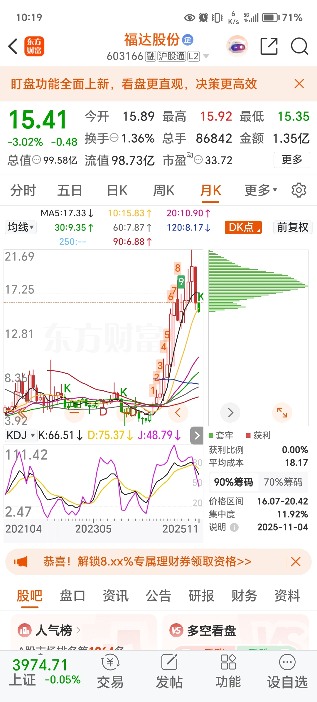 $福达股份(SH603166)$ 月线0获利,全部是套牢盘,去补7块钱的缺口去了