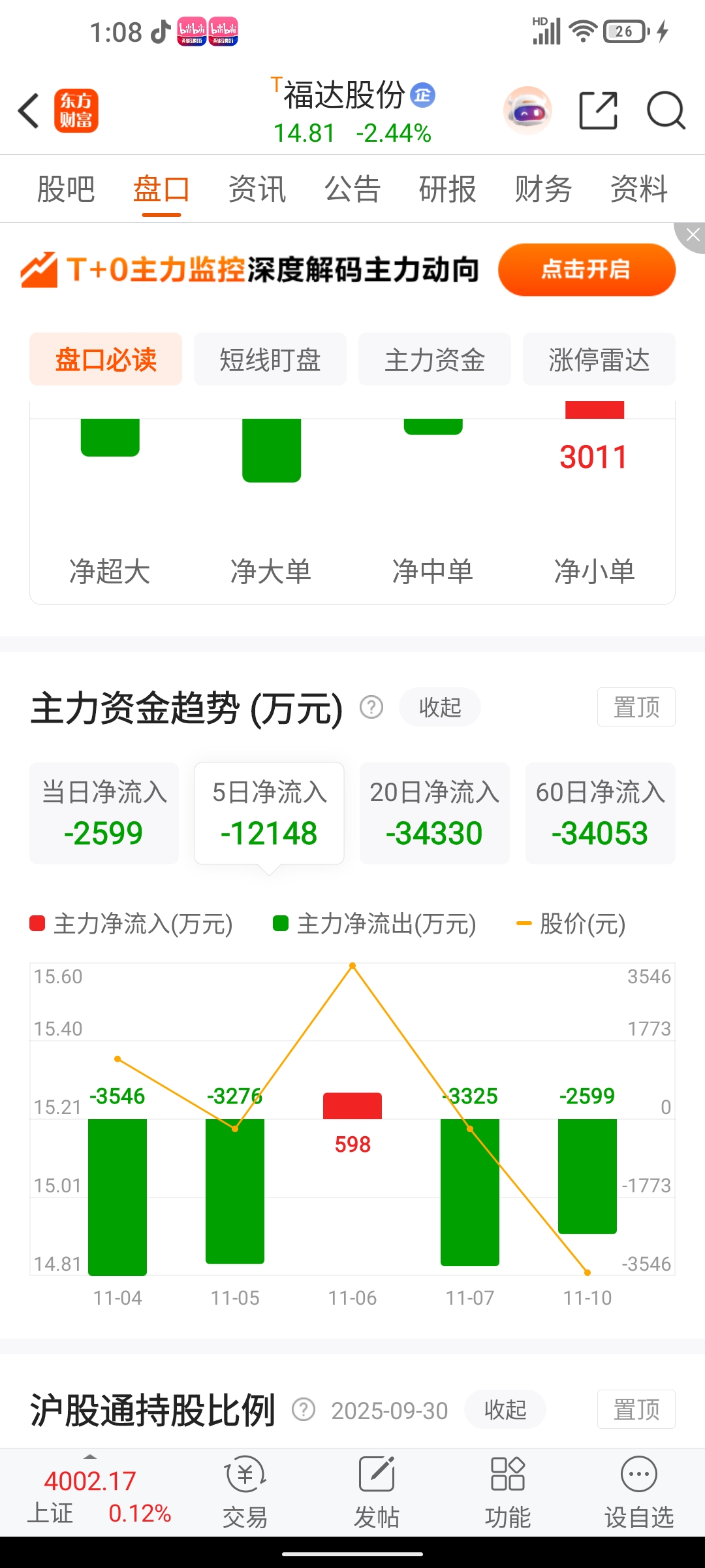 $福达股份(SH603166)$ 今天主力流出资金肯定还是三千多万
