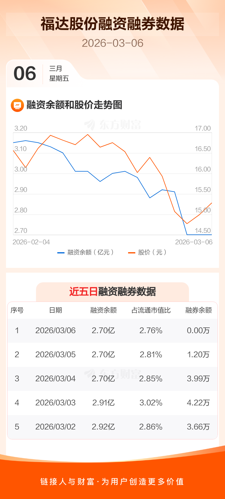 交易所最新数据显示,福达股份于2026年3月6日获融资买入834.41万元,融资偿还772.99万元,当日融资净买入61.42万元。目前,该股融资余额2.70亿,占流通市值比例为2.76%。