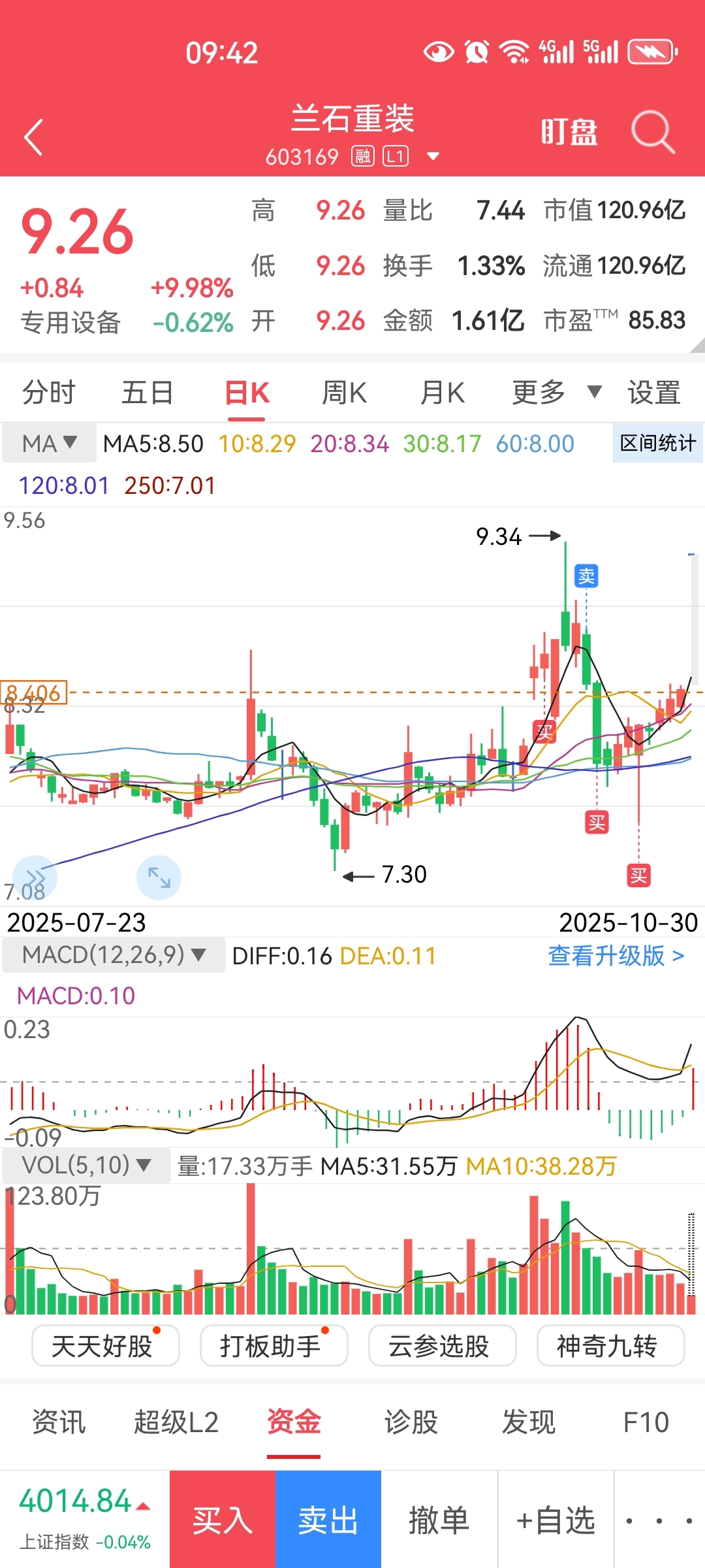 $兰石重装(SH603169)$ 高位进的,后天下跌卖了半仓,逢低又补回来了,然后又在次日金针探底加仓,然后就是好多天的等待,终于等到你