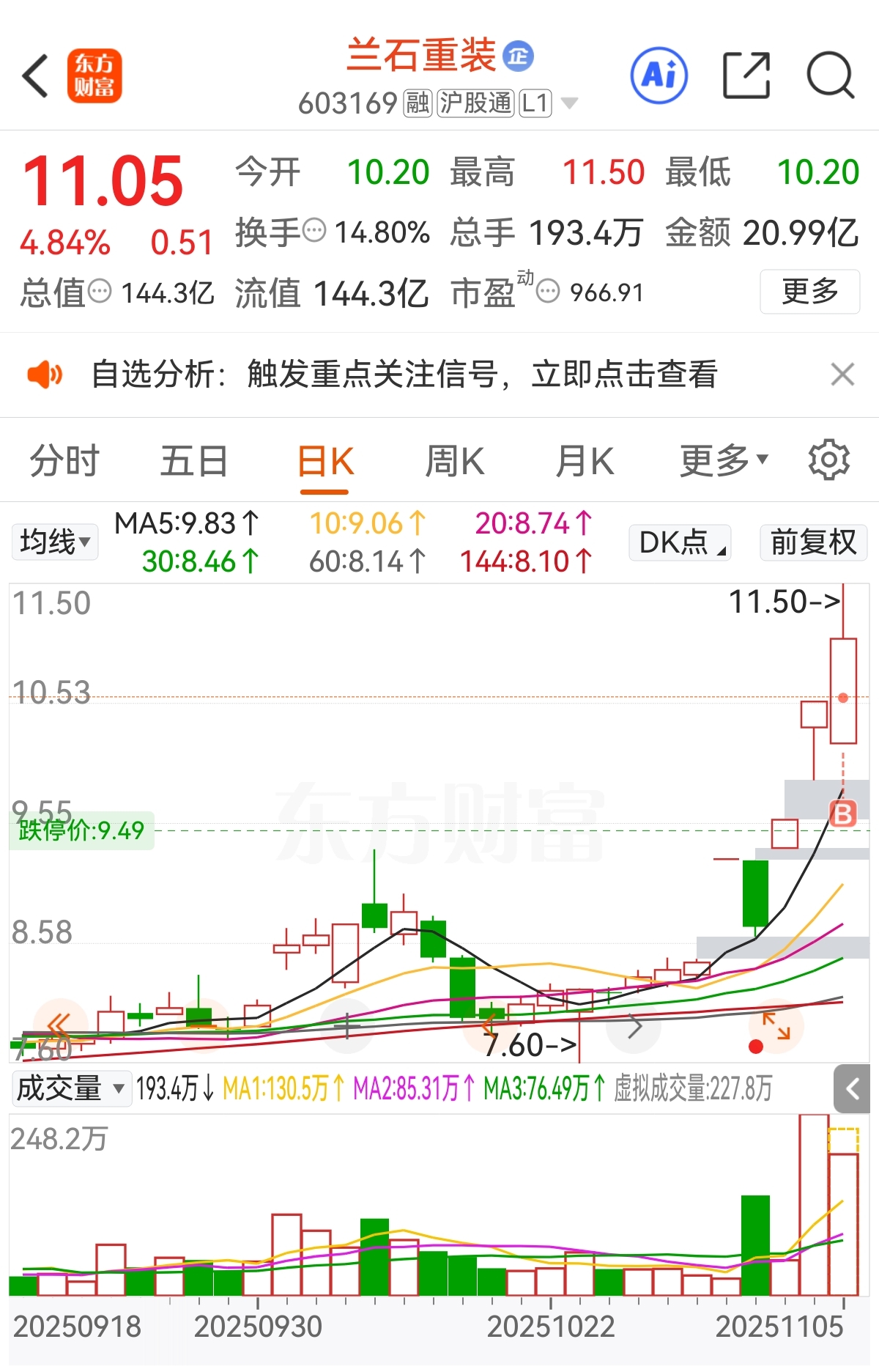$兰石重装(SH603169)$ 本来挂买盘水下买的,结果开盘居然抢不到,只好水面附近买入。