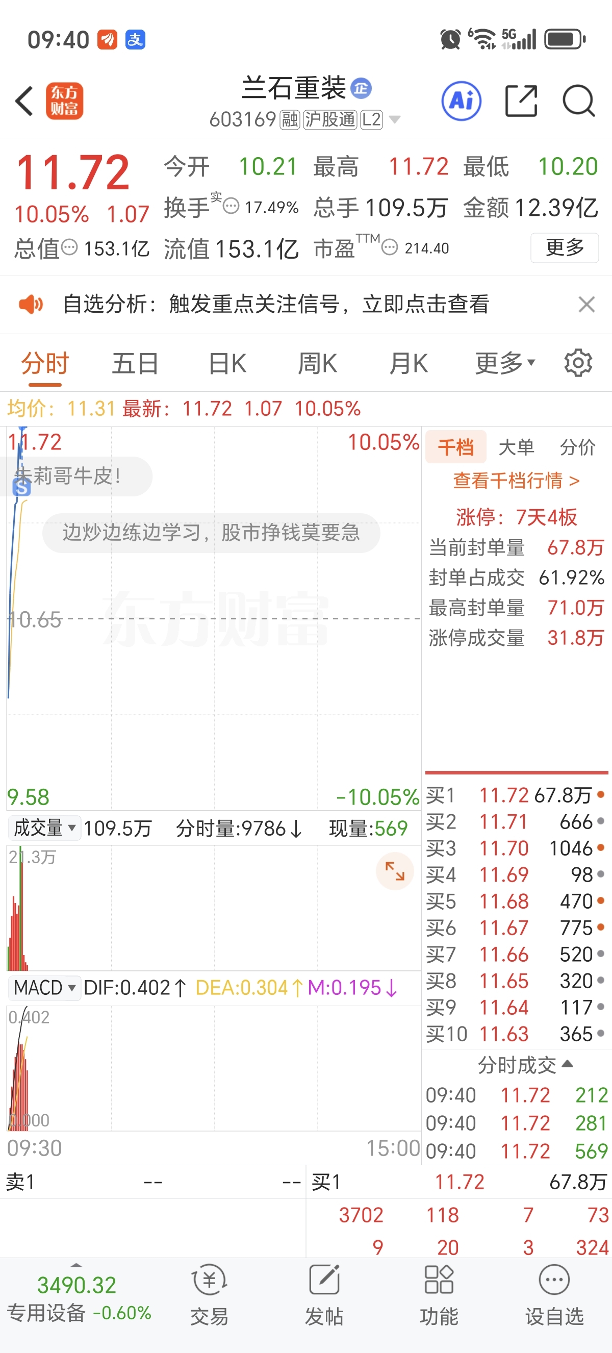 $兰石重装(SH603169)$ 虽然我卖了,,但今天肯定涨停,会回封的,打板的别着急