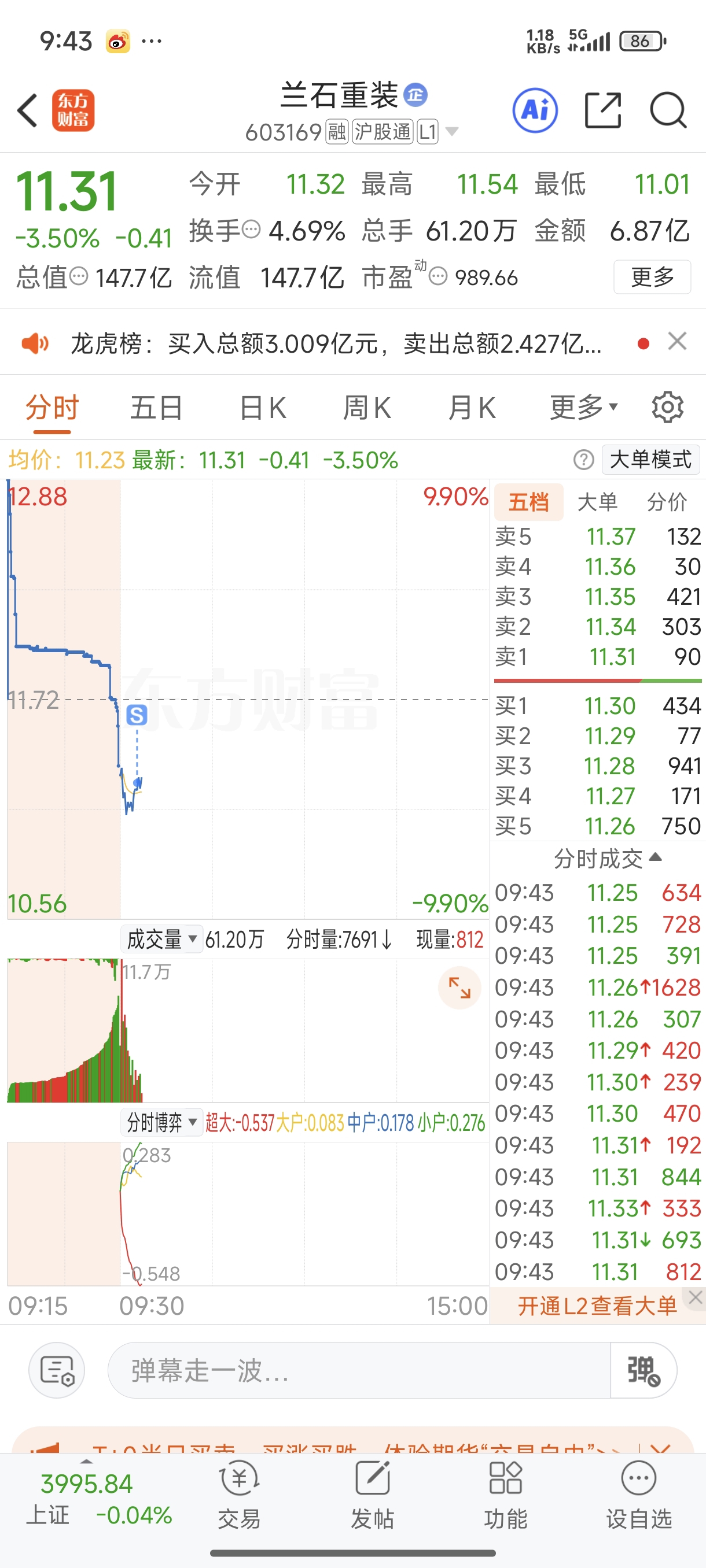 $兰石重装(SH603169)$ 难受,跑了跑了,亏三个点,和我周五预测的差不多,如果是洗盘也认了,就是怪自己割的不够果断