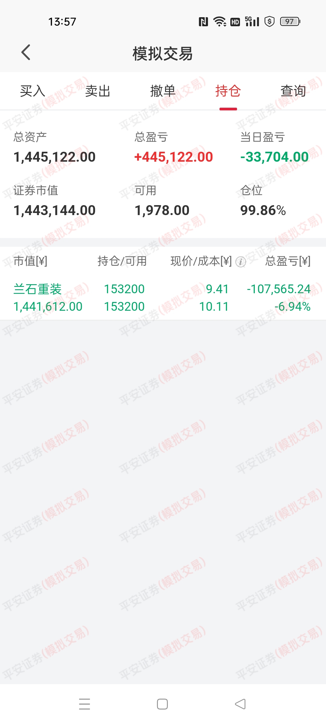 $兰石重装(SH603169)$ 我模拟盘买了150万,亏成什么样子了。