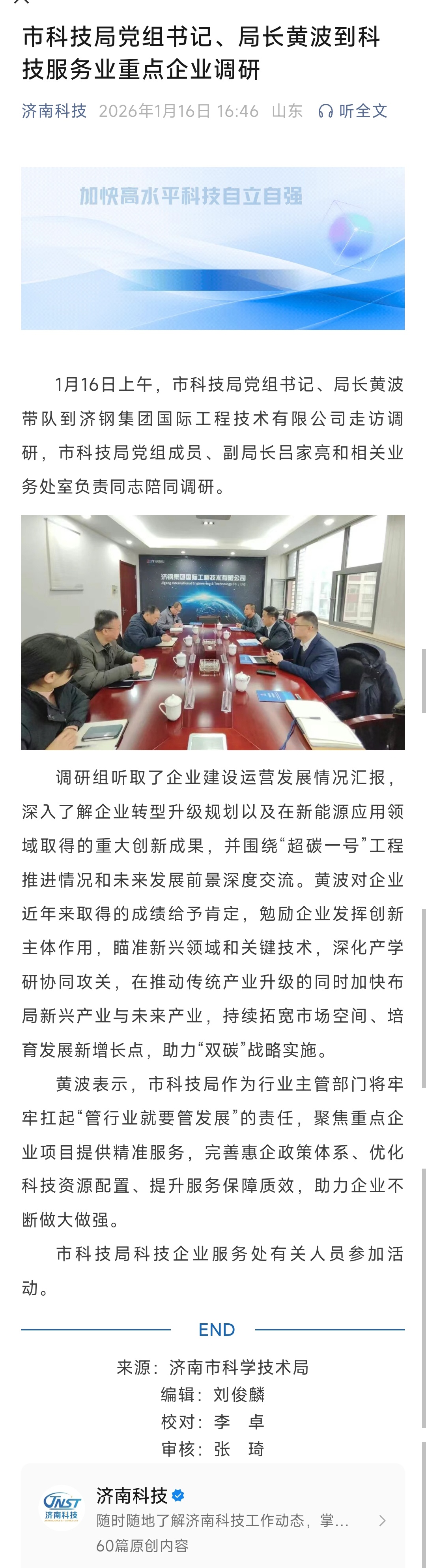 $兰石重装(SH603169)$ 1月16日上午,市科技局党组书记、局长黄波带队到济钢集团国际工程技术有限公司走访调研,市科技局党组成员、副局长吕家亮和相关业务处室负责同志陪同调研。