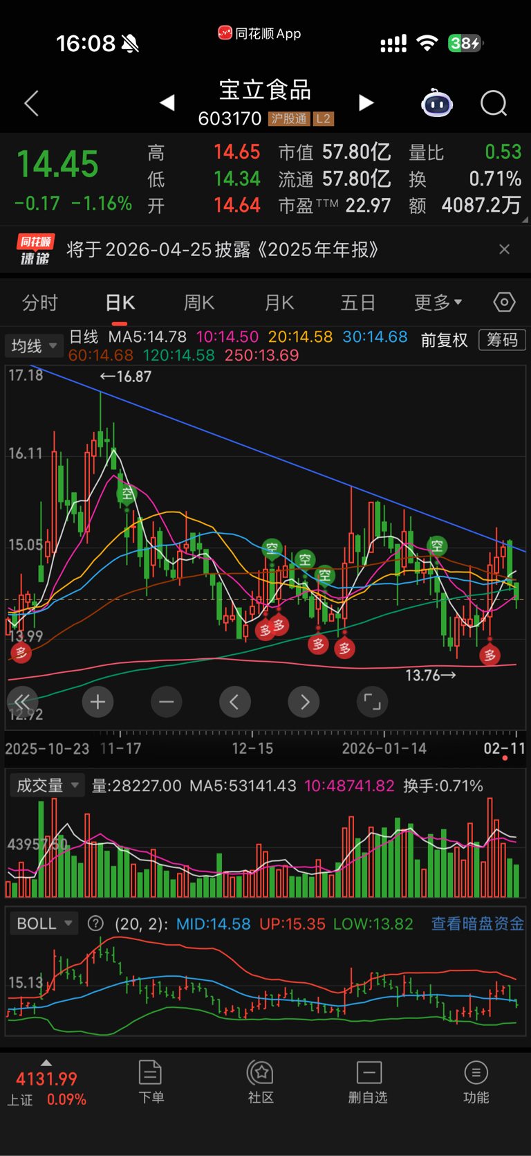 $宝立食品(SH603170)$ 低点越来越低,日周月线都在下降通道中,周五买了点底仓,这周站稳通道上我都准备打满了,但是这几天的表现,是我判断错了,根本没有主力,跟着板块涨跌的量化模型而已,在观望的可以放弃了,今天清了,要等放倍量大阳突破再看了,研究了下基本面,现在这个价格是这只票的正常估值,很难有什么大起大落的表现,根本原因还是业务发展没有科技那种想象力跟预期