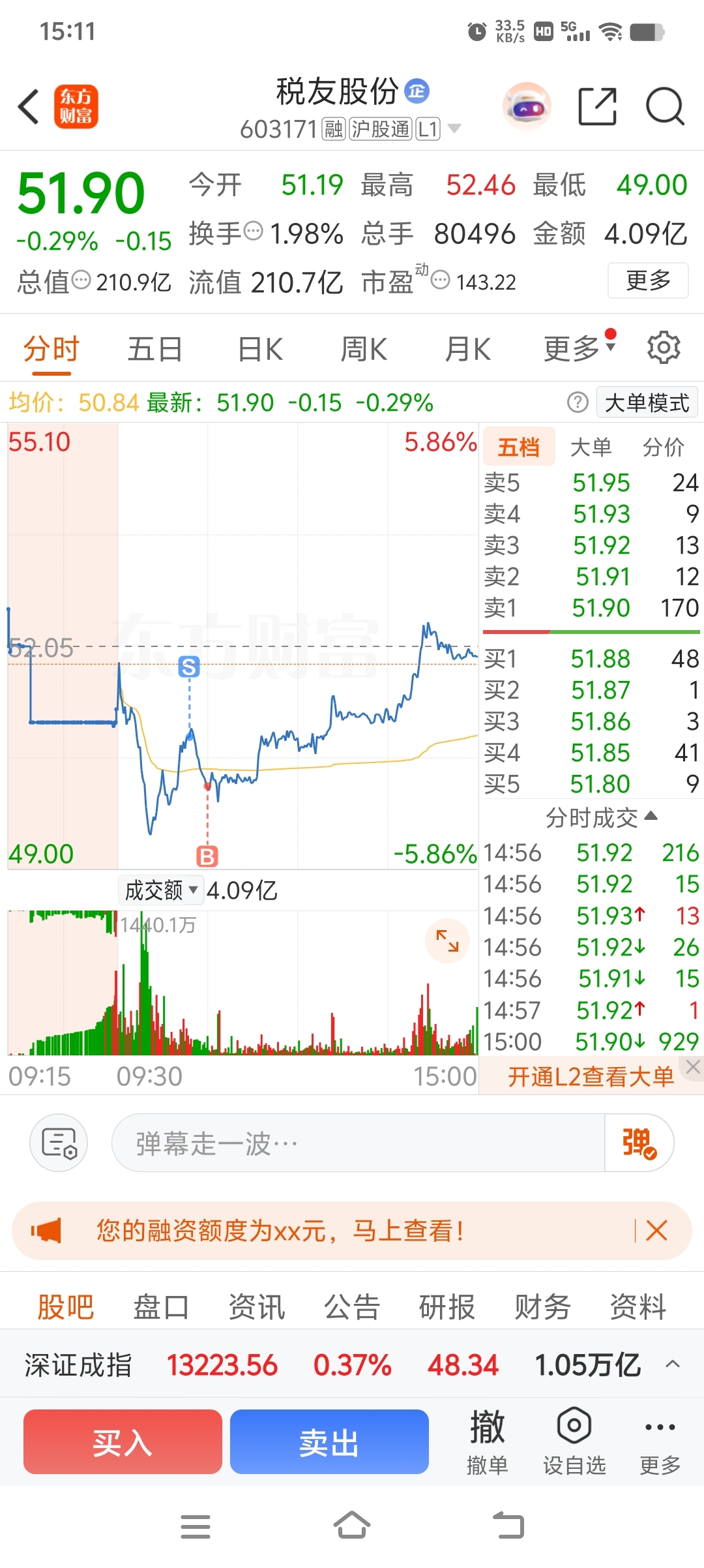 $税友股份(SH603171)$ 多亏t了一下,要不今天亏钱