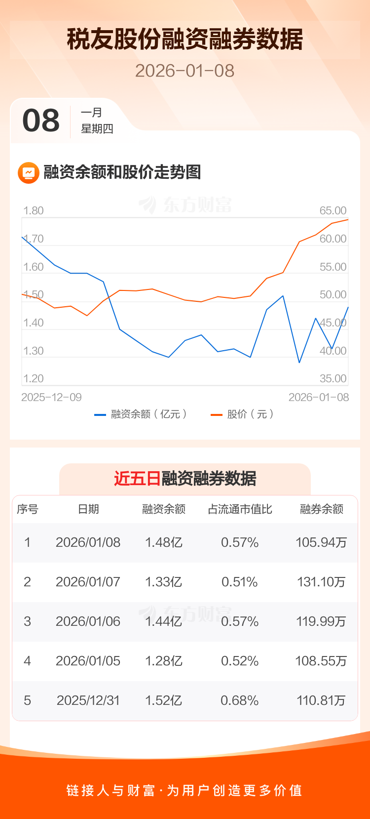 交易所最新数据显示,税友股份于2026年1月8日获融资买入4955.17万元,融资偿还3405.52万元,当日融资净买入1549.64万元。目前,该股融资余额1.48亿,占流通市值比例为0.57%。