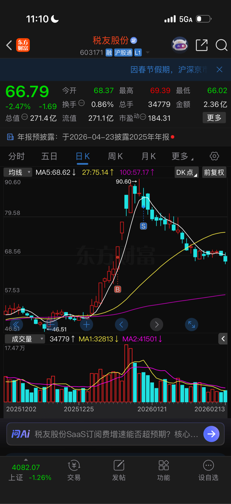 算我逃顶比较好的案例。税友当时我觉得有问题,有几个基金把它排第一重仓,这就很奇怪,一了解流通股这么低,股价很好拉我就懂了,这是基金拿来抱团做业绩的。这种票如果行业特别好,会很强势,一旦风口不在,死的贼快。