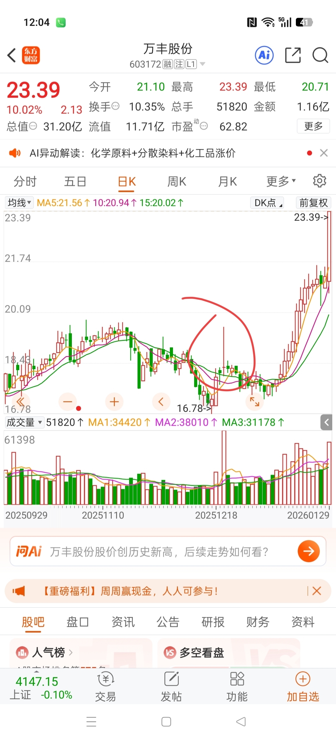 $万丰股份(SH603172)$ 这种主力高开吊颈线,不要随便删除,找合适机会买,比如均达量能一直在就不存在结束,消化管左不管右,直接突嘎嘎猛,