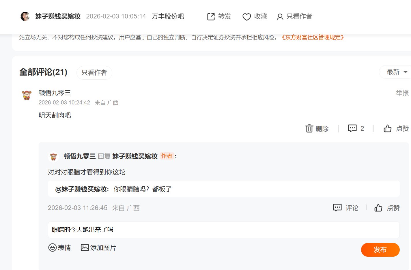 温馨提示: 1.根据《证券法》规定,禁止编造、传播虚假信息或者误导性信息,扰乱证券市场;2.用户在本社区发表的所有资料、言论等仅代表个人观点,与本网站立场无关,不对您构成任何投资建议。用户应基于自己的独立判断,自行决定证券投资并承担相应风险。《东方财富社区管理规定》