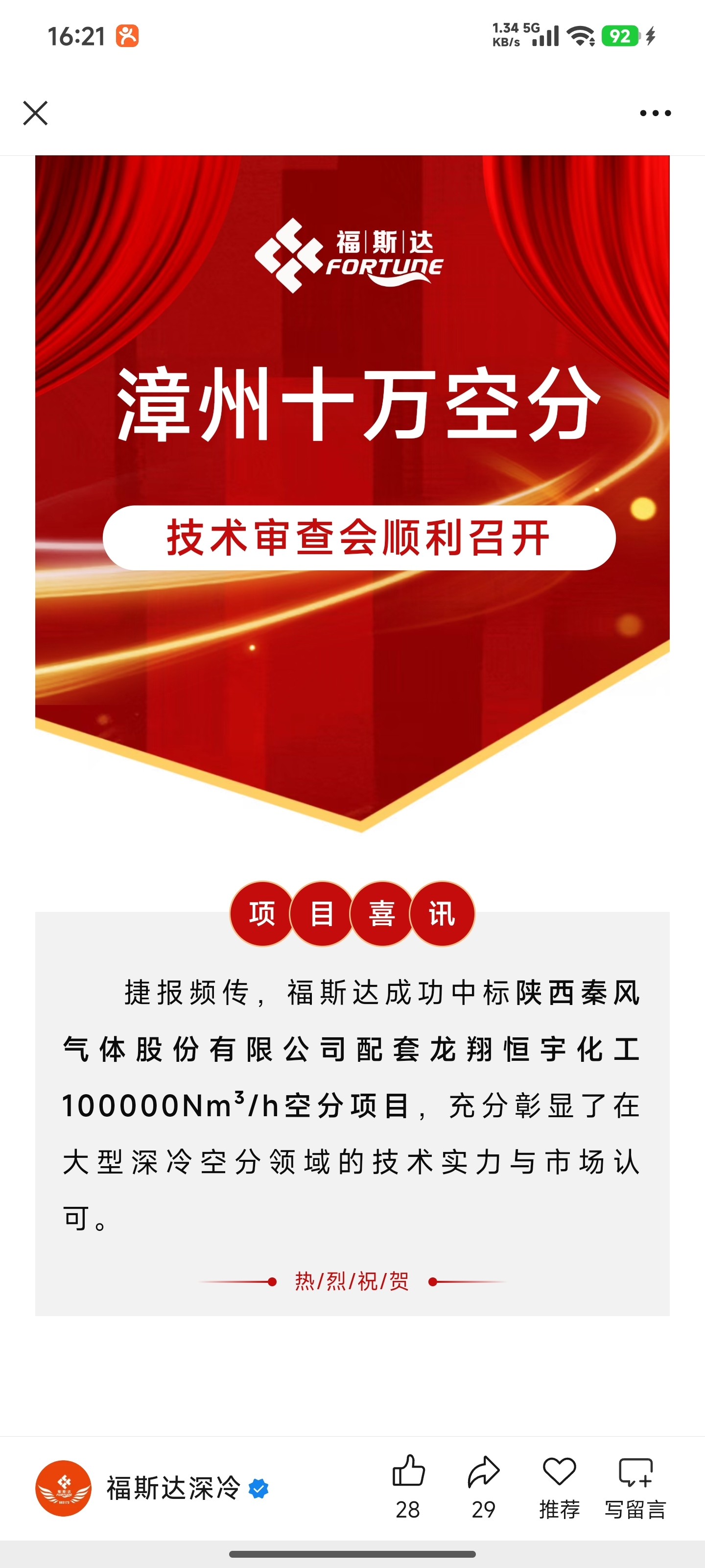 $福斯达(SH603173)$ 嗯,公众号也的确看到了,中了一个10万。方的这样一个工程,是第1次吧,好像进入了杭氧垄断的这个区域了。但是呢,不涨还是不涨,业绩公告涨这么多,股价也没反应。