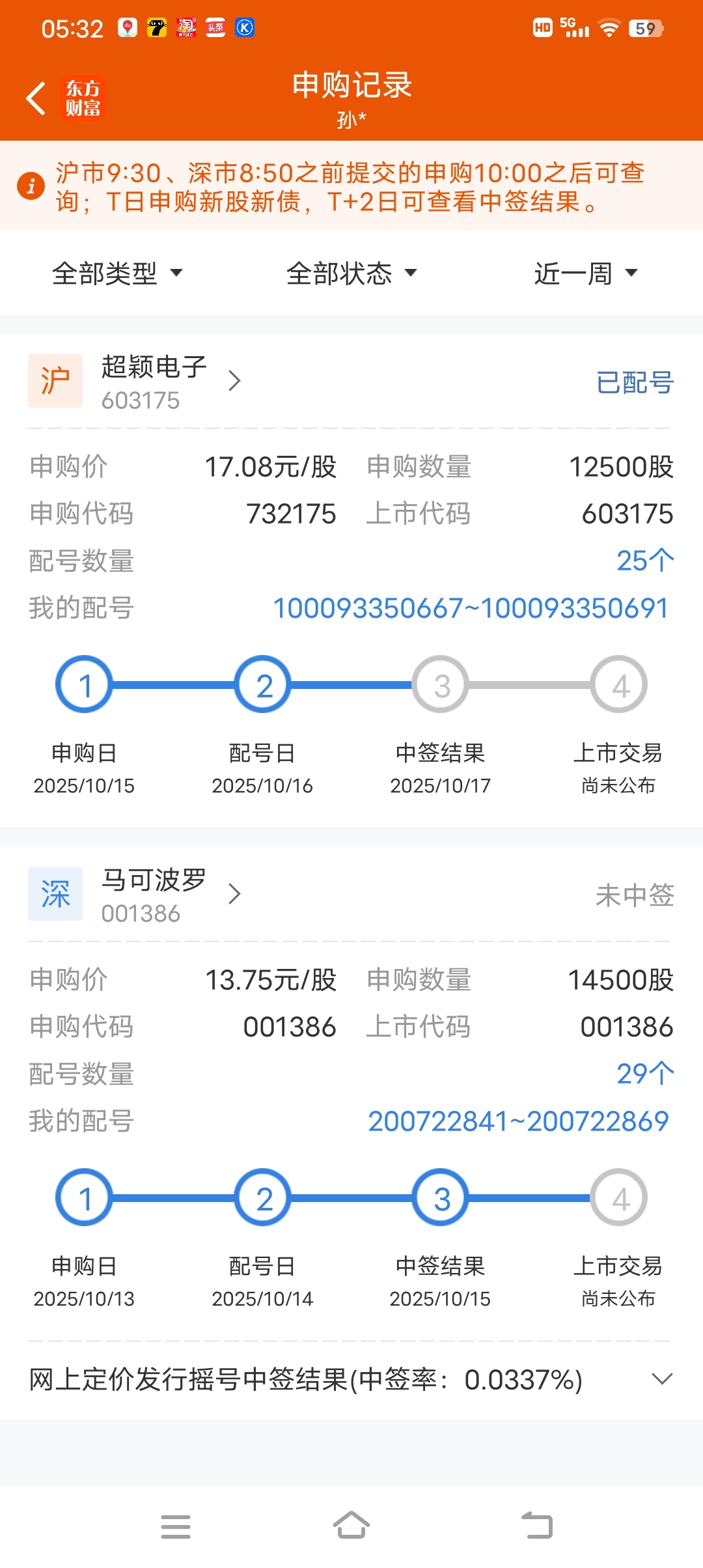 $超颖电子(SH603175)$ 看 配号又是陪跑的货,一次新股都没中过。兄弟们你说这次能不能是个意外?