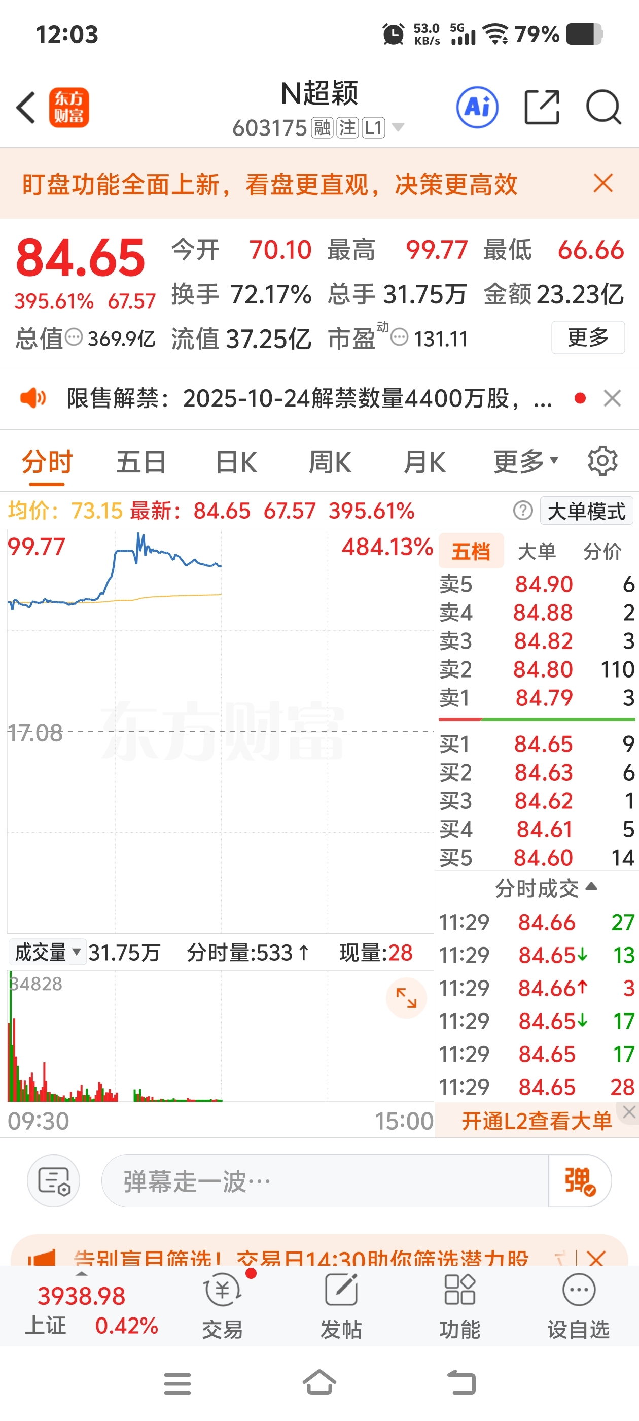 $N超颖(SH603175)$ 有没有一种可能,上午的拉升,是为了网下配售的股票兑现?如果是这样,上午的最高价99.77,有没有可能成为“对子顶”?拉升太早,我是不敢买