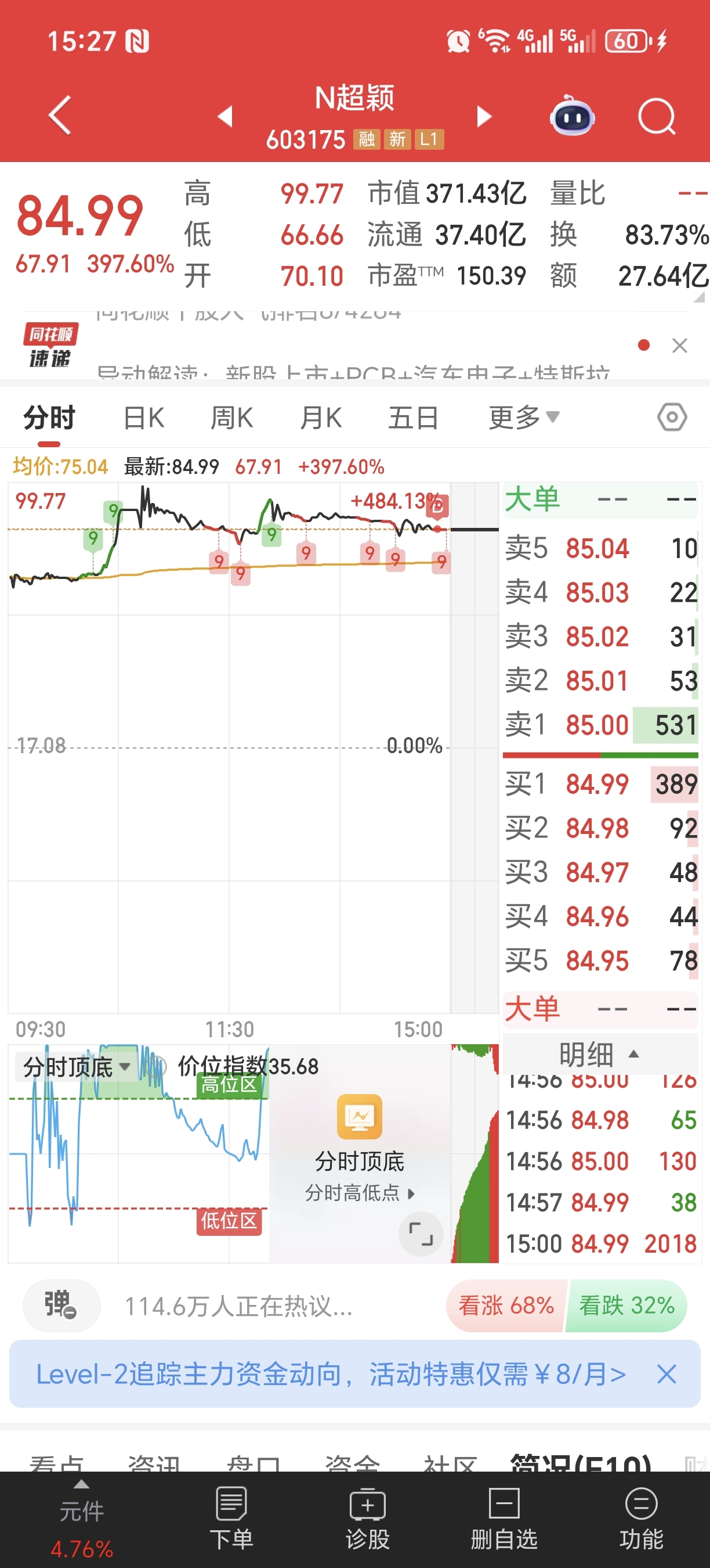 $N超颖(SH603175)$ 早上70一直看不敢买,尾盘85买了,下周涉涉发抖