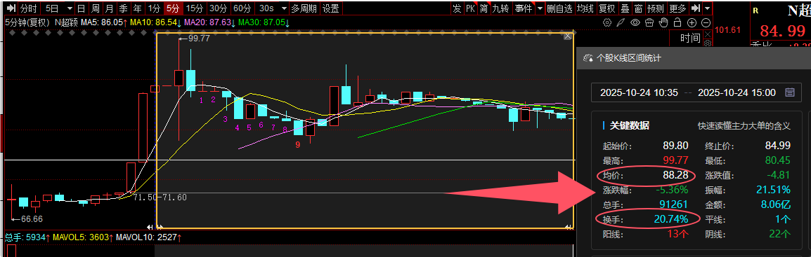 从早盘10:35到收盘,换手率只有20.74%,平均股价88.28元。