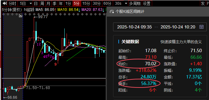从早上开盘到早盘10:20分,换手率高达56.37%,平均股价为70.02元,按当天收盘价计算,这部分筹码收益高达 21.38%,即使明天低开10.00%,也有9.24%的收益,就一天时间,这收益大部分做超短线的人都会跑了。若明天高开,股价将瞬间跌下来。低开换手,才是王道。