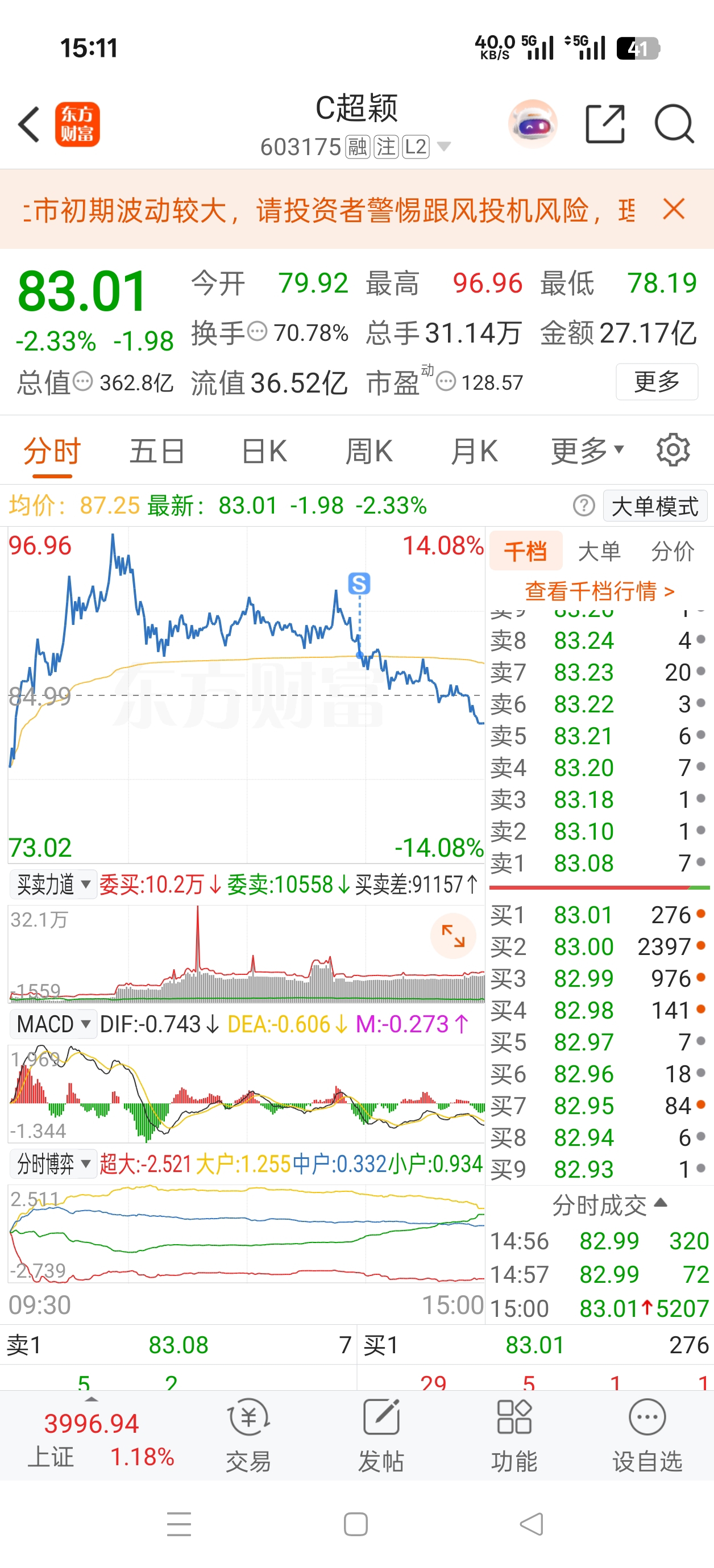 $C超颖(SH603175)$ 96没卖,下午反弹到93也没卖!最后看破了均线87.8卖了!真不能太格局了,一格局就少了10个点!明天看看能不能在75的位置接回来!
