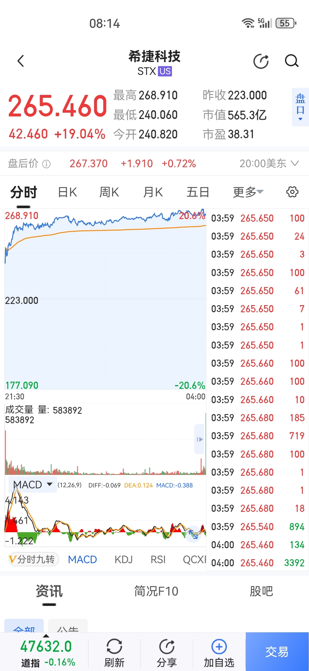 希捷科技暴涨,大家预测一下今天超颖几个临停