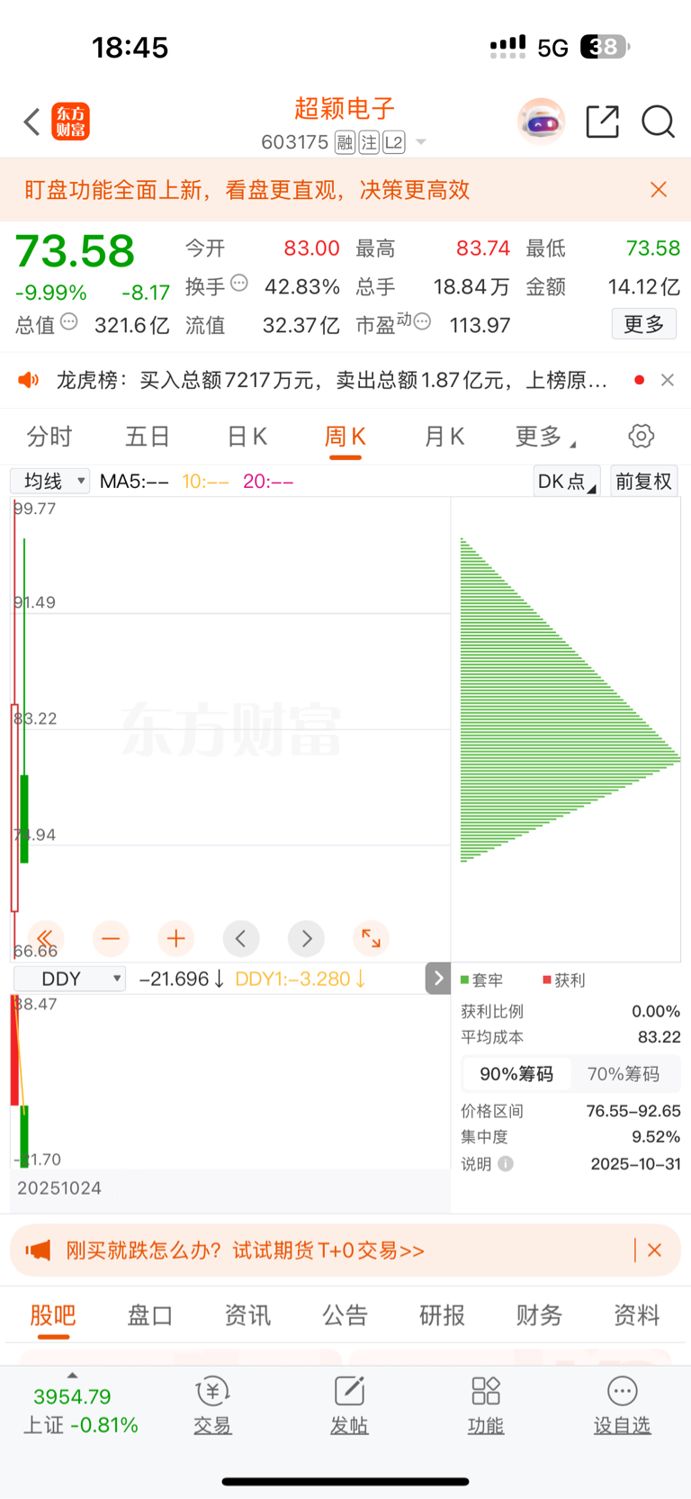 $超颖电子(SH603175)$ 本周交易下来,获利盘0,平均成本83.22,迅速杀到跌停附近,龙虎榜上砸盘的大都是割肉出逃