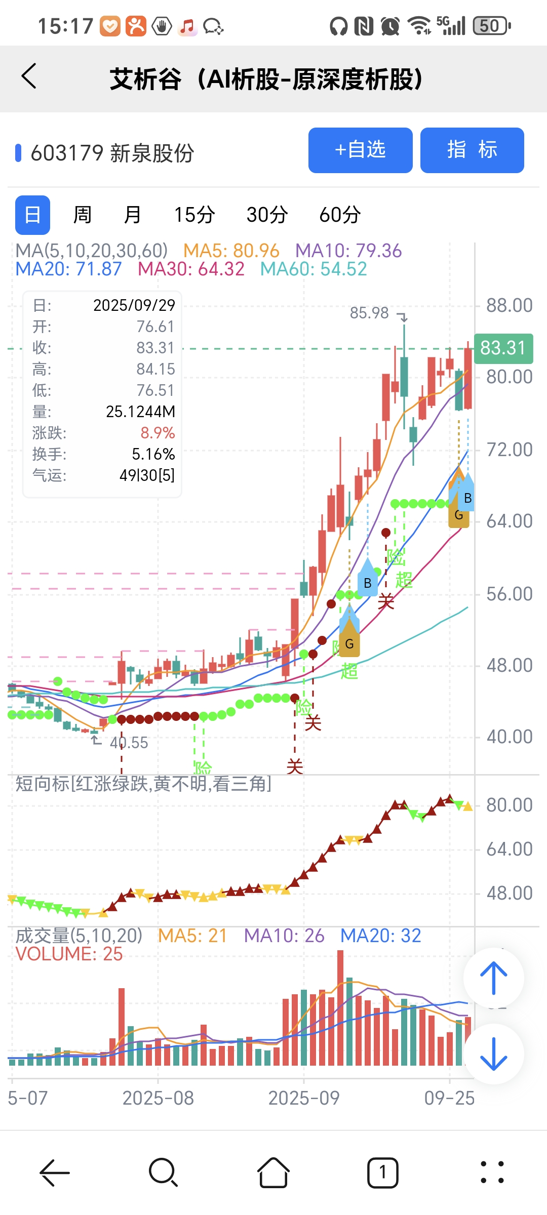 图中 B、G 关注标记是对应AI选股模型当天下午2点多给出。