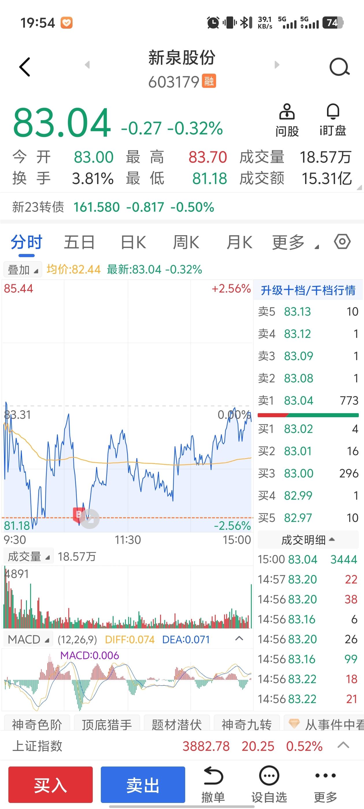 $新泉股份(SH603179)$ 昨天开盘79卖飞了,今天差不多在最低点接回来不知道对不对