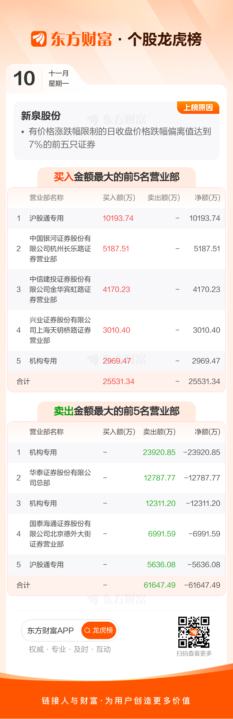 交易所2025年11月10日公布的交易公开信息显示,新泉股份因成为有价格涨跌幅限制的日收盘价格跌幅偏离值达到7%的前五只证券上榜。新泉股份当日收报69.3元,涨跌幅-10.00%,偏离值-10.53%,换手率4.75%,成交额17.17亿。