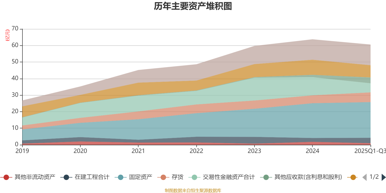资产重大变化方面,截至2025年三季度末,公司交易性金融资产合计较上年末减少49.93%,占公司总资产比重下降8.16个百分点;其他应收款(含利息和股利)较上年末增加146.74%,占公司总资产比重上升3.6个百分点;固定资产较上年末增加2.66%,占公司总资产比重上升2.64个百分点;存货较上年末增加23.28%,占公司总资产比重上升2.22个百分点。